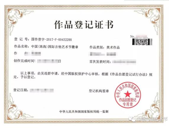 据中国(珠海)国际吉他艺术节秘书长、中国吉他产业峰会副秘书长、珠海市吉他协会会长殷巧女士介绍:经过长达一年的准备,“中国(珠海)国际吉他艺术节徽章”图形连同中英文翻译对照全部获得中国国家版权保护局、中国版权保护中心登记,注册号为:”国作登字-2017-F-00432288“号!