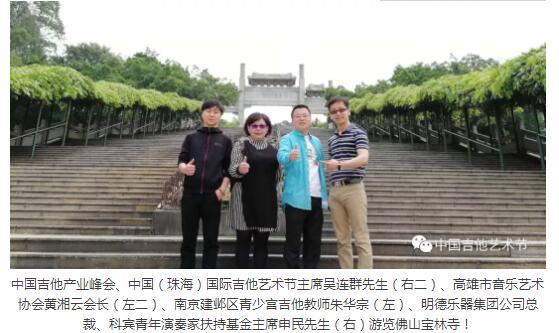 中华吉他网3月14日佛山讯:高朋满座,今日明德乐器集团公司,迎来了南京、高雄、东莞、珠海、广州客人到访,受到集团总裁、科宾青年演奏家扶持基金主席申民先生热情邀请!中国吉他产业峰会、中国(珠海)国际吉他艺术节主席吴连群先生、办公室主任殷巧女士、高雄市音乐艺术协会黄湘云会长、东莞六弦琴行冯启基、南京建邺区青少宫吉他教师朱华宗、广州吉他教师梁政聪等客人到访南海明德乐器集团公司!并游览佛山宝林寺!