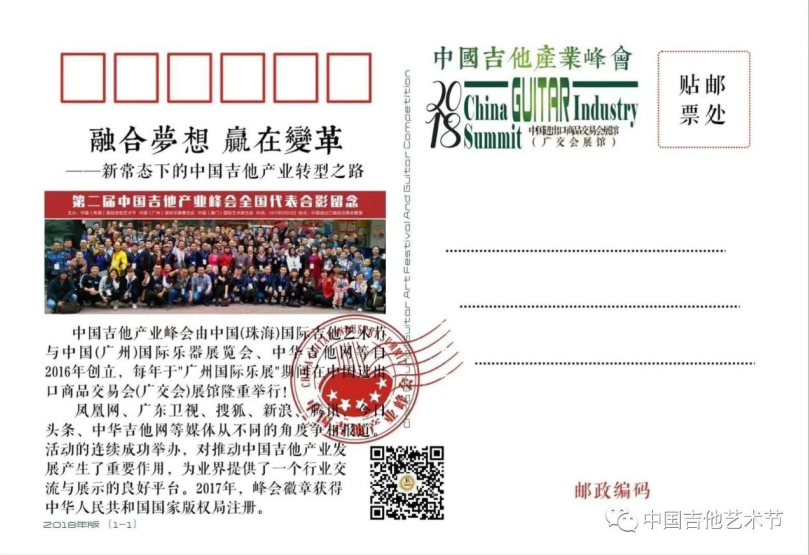 同时,根据峰会秘书长刘庆松先生透露,峰会期间将发行主题明信片一套,为了让我们的文艺情怀得到更好的体现,组委会将安排中国邮政发行的法定邮票提供给有需要实寄明信片的吉他名家和老师们!敬请期待!