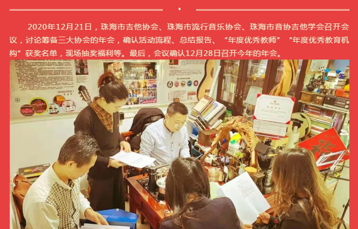 2020年12月21日,珠海市吉他协会、珠海市流行音乐协会、珠海市音协吉他学会召开会议,讨论筹备三大协会的年会,确认活动流程、总结报告、“年度优秀教师”“年度优秀教育机构”获奖名单,现场抽奖福利等。最后,会议确认12月28日召开今年的年会。